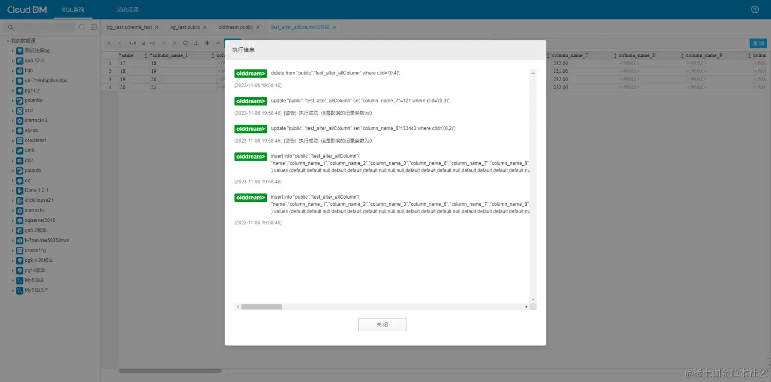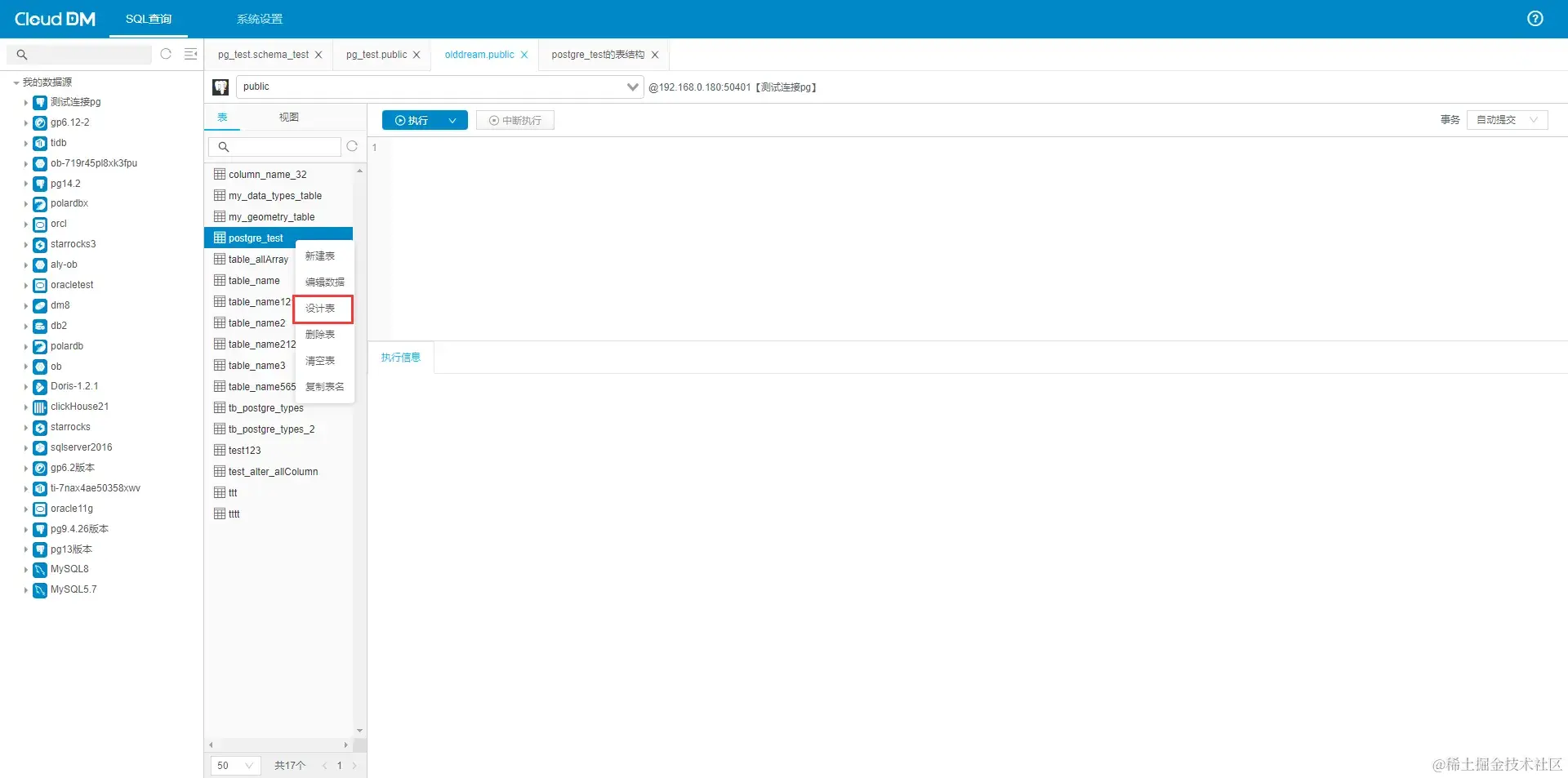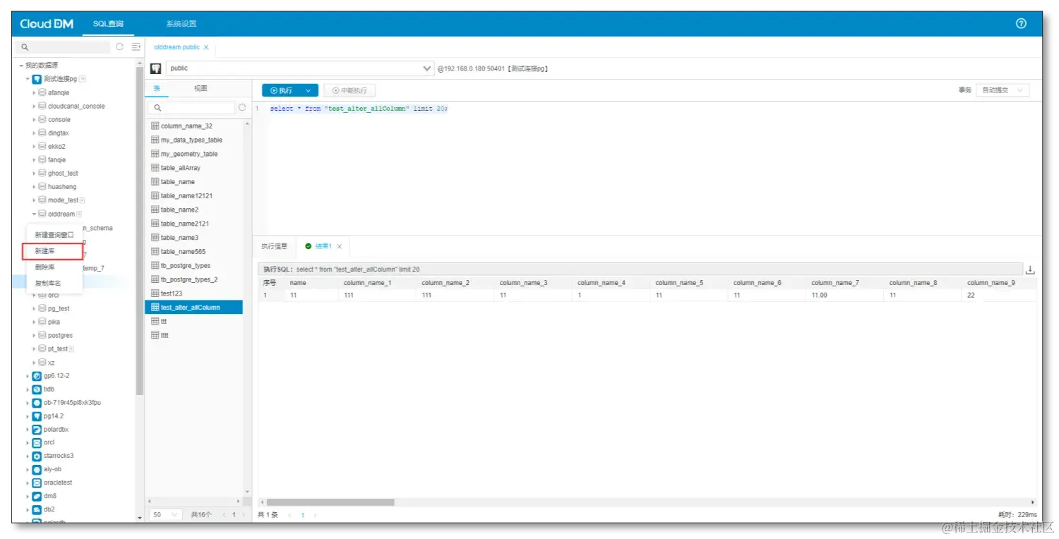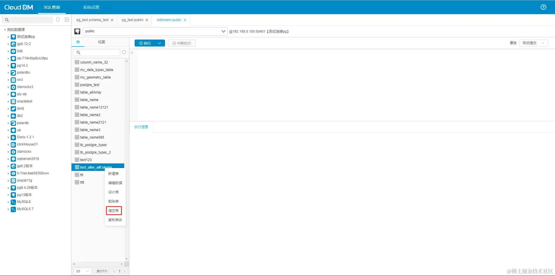 目前,CloudDM 对数据库表的管理比较的齐全,包括创建表,删除表,修改表,清空表同时对 postgreSQL 的 DDL 支持比较齐全,可以应对大量的场景。
