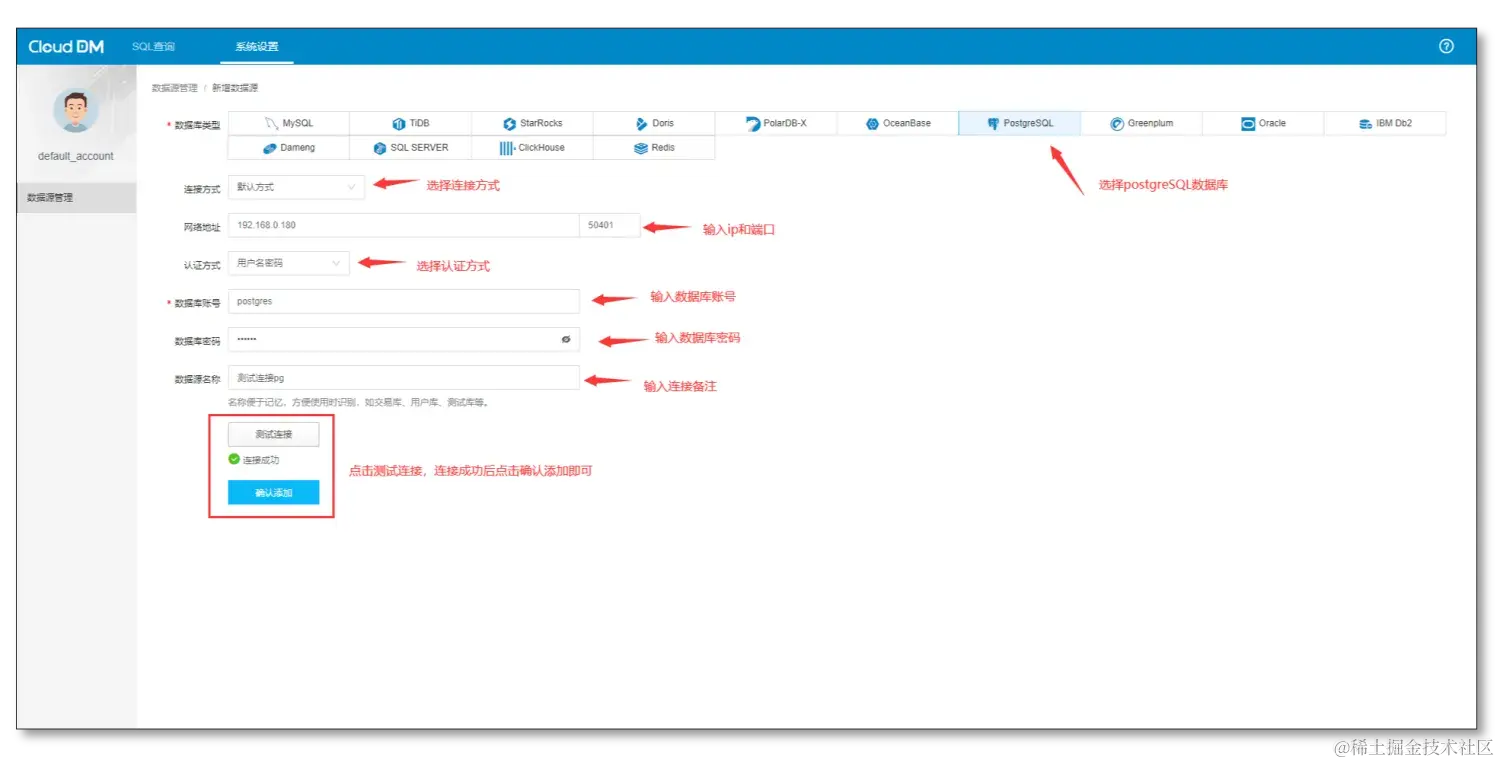 - 选择 PostgreSQL 数据库,然后输入连接参数进行连接