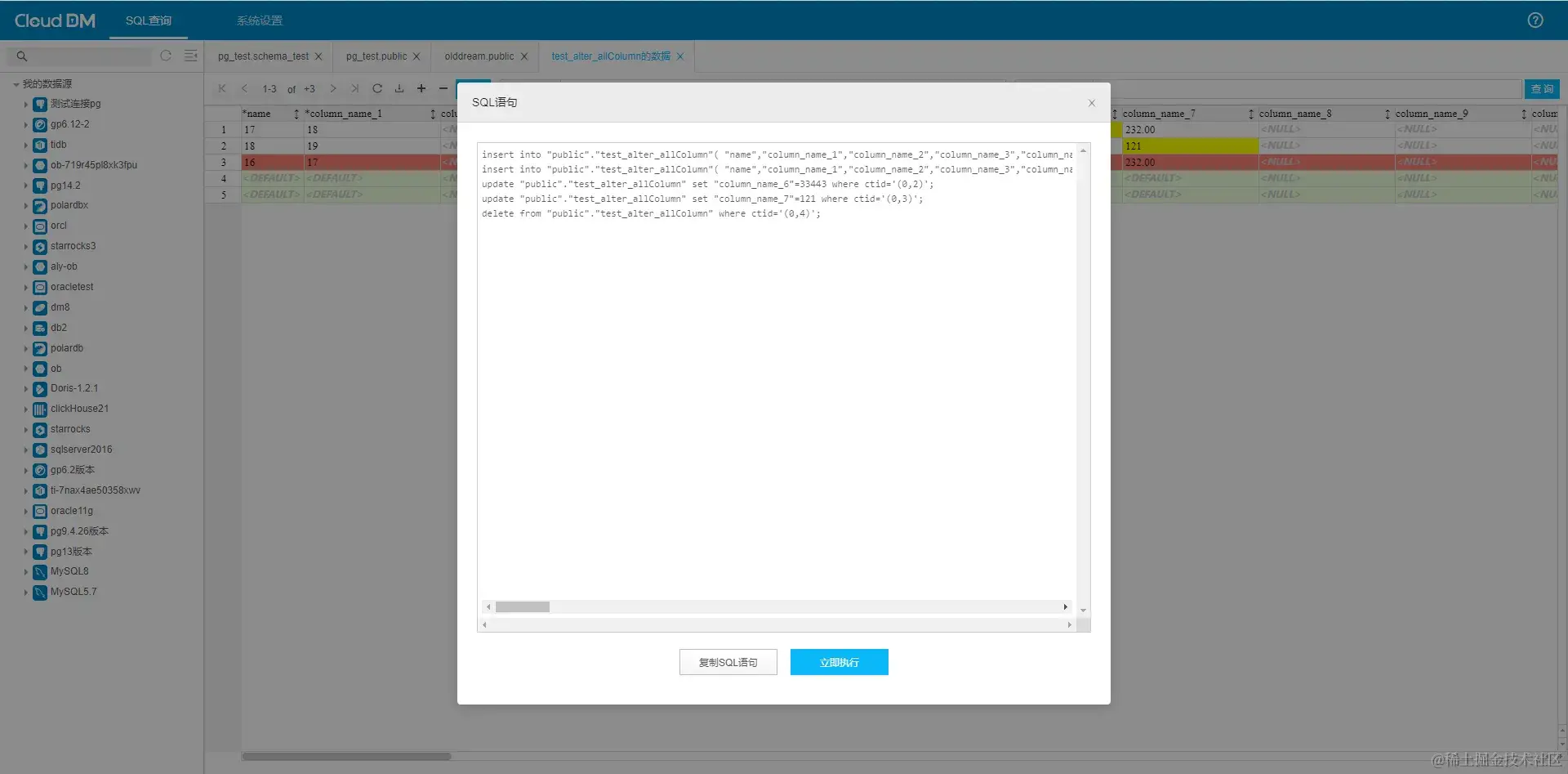 同样的,CloudDM 支持对表的数据进行编辑,操作包括数据条件查询,插入数据,修改数据,删除数据操作;