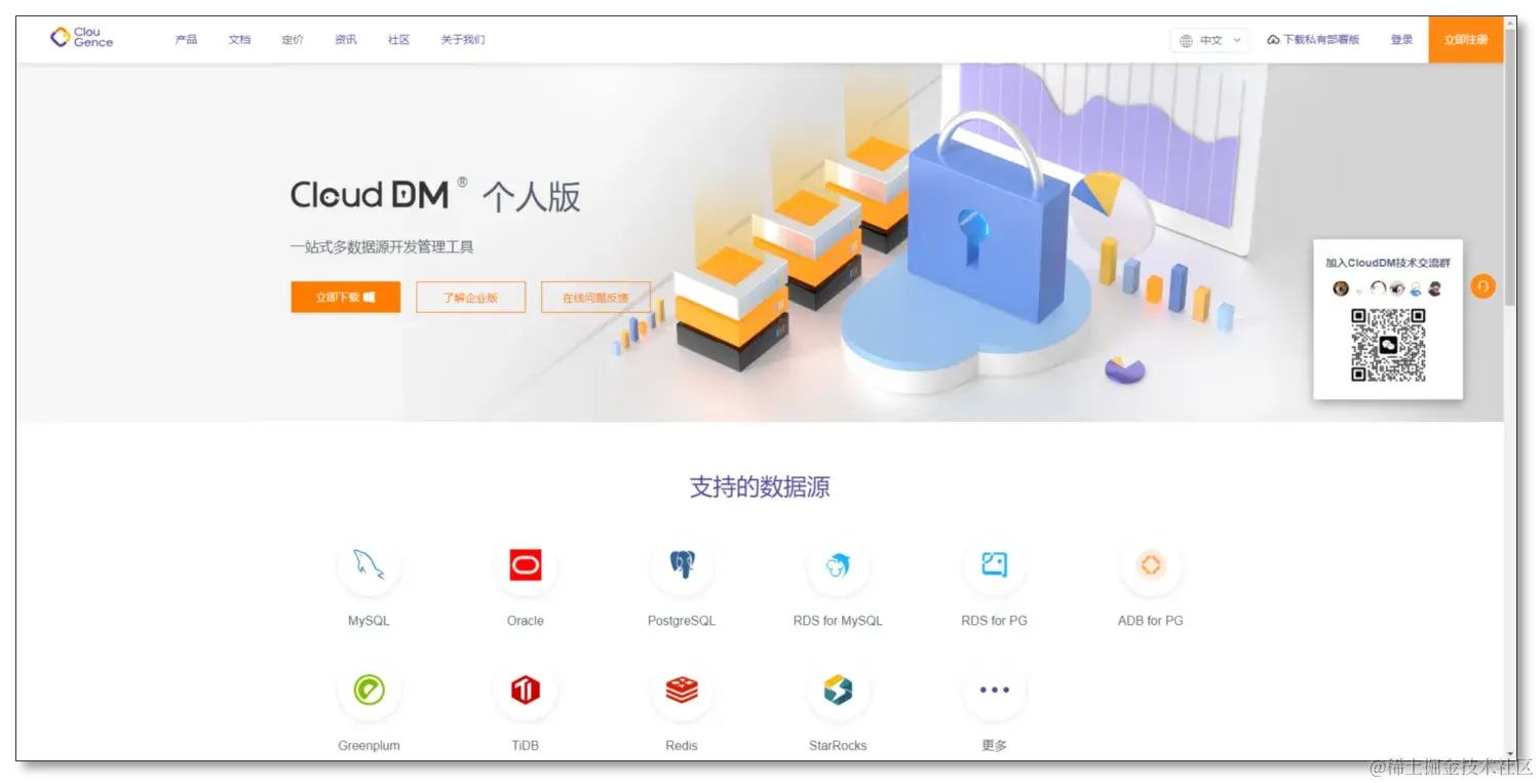 CloudDM 是 ClouGence 公司推出的一款一站式数据库管理工具,使用它可以方便地访问和管理 MySQL、Oracle、PostgreSQL、阿里云 RDS、Greenplum、TiDB、Redis、StarRocks、Doris、SelectDB、SQL SERVER、ClickHouse、OceanBase 、PolarDB-X 、IBM Db2 等多种不同类型的数据库。通过 CloudDM 丰富的数据源支持可以避免在多个专业工具之间切换,从而提高工作效率。