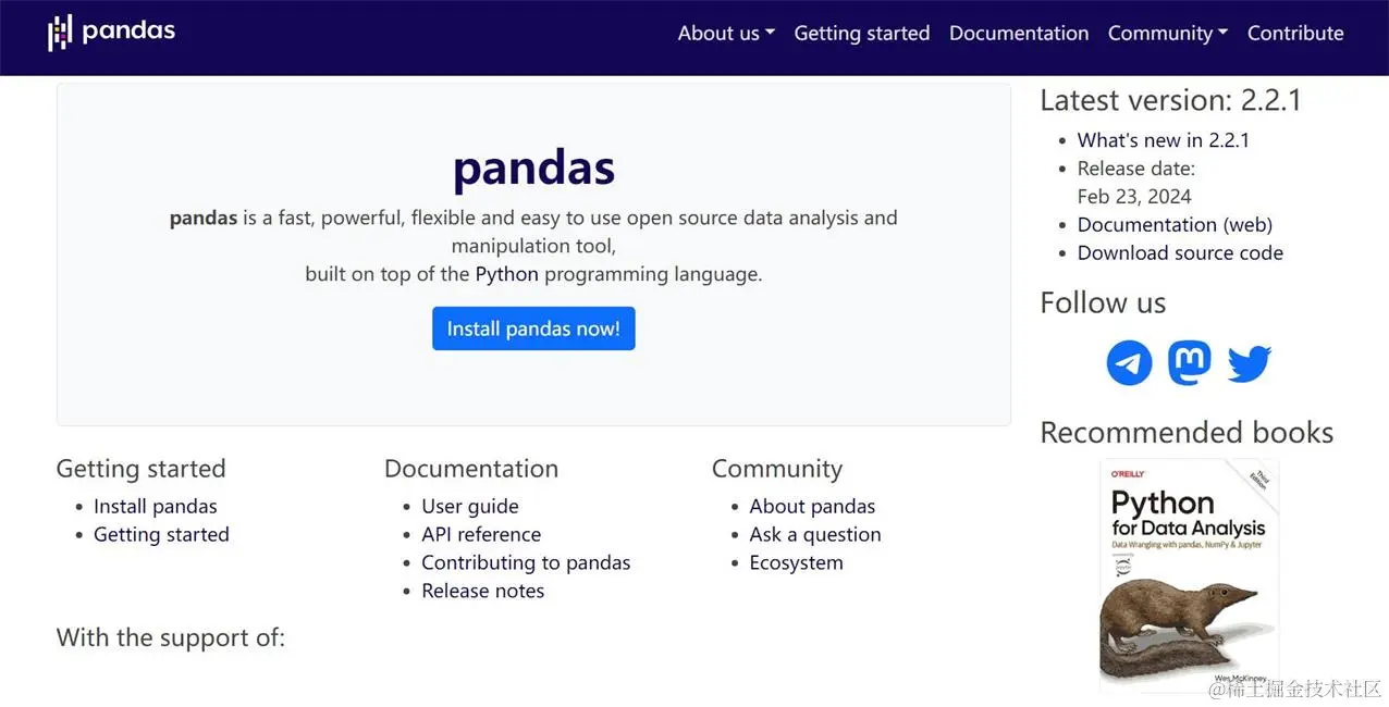 目前Pandas是托管在github上面的,从github上面的star数量可以看出,这个库还是非常受欢迎的。目前主要Python和C/C++来开发的,开发者如果对这个第三库有兴趣,可以自行提交相关的补丁。