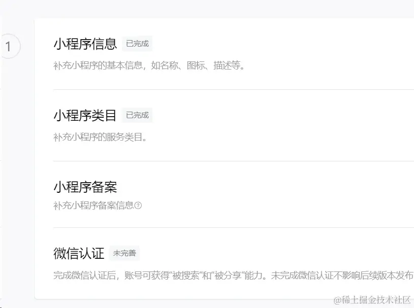 小程序信息、小程序类目、微信认证,这三个内容。小程序备案最后再来处理。