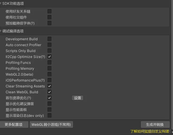 这里根据自己的项目对打包参数进行设置,如果你打包的总包大小超过20M,会有弹窗提示,代表你需要使用游戏资源CDN服务器来寄存资源,我这边是个单机小游戏,包体大小在10M左右,所以就不使用CDN资源服务器了,使用资源CDN服务器需要额外做一些设置,并且每个月要支付高达19¥的巨额费用。