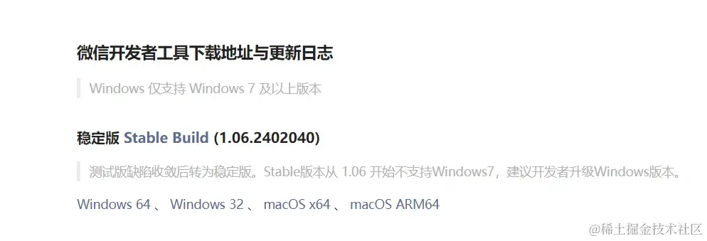 微信开发者工具实际上就是给开发者在调试微信小程序的一个工具,我们可以根据微信开发者工具里的实际表现来对我们的Unity工程进行修改,不过具体还是得以实际为准,这里的微信开发者工具(小游戏版)是给用微信开发者工具开发的小游戏使用的,我们用Unity开发的小游戏实际上还是个小程序,所以得用小程序的版本,而不是小游戏的版本,我们选择微信开发者工具-小程序-稳定版本下载即可。
