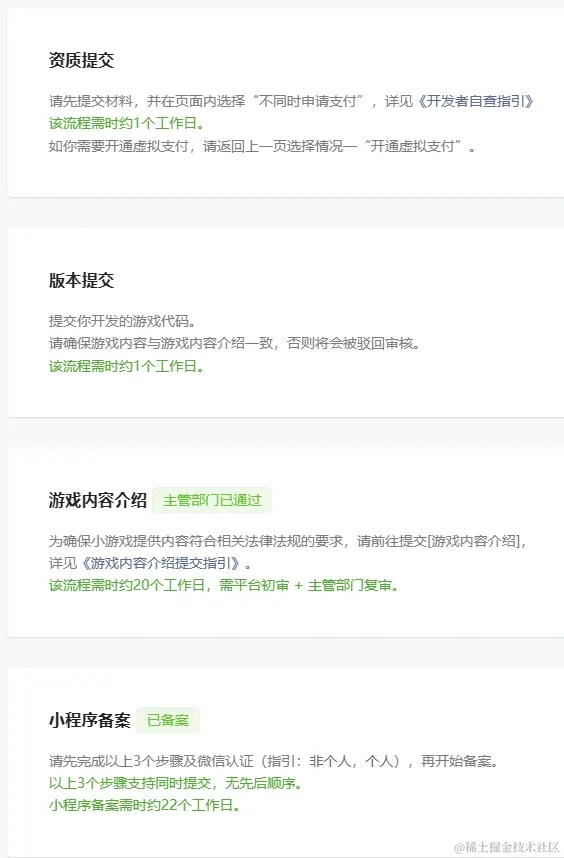 其实这个时候可以开始准备相关游戏资质,以及填写游戏内容介绍,虽然不能提交,但是我们可以先填写好,然后再审核期间再对我们的Unity工程进行相关设置。这里梳理了一下,先要完成四个小步骤。