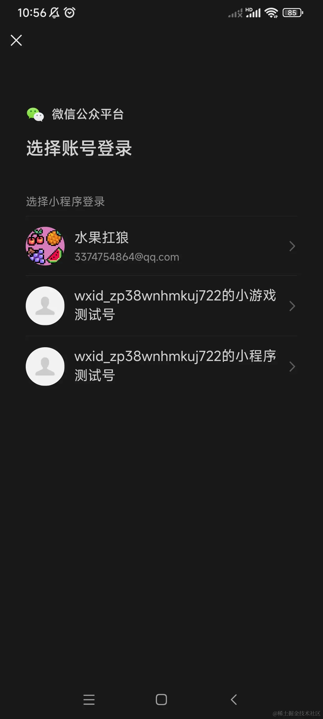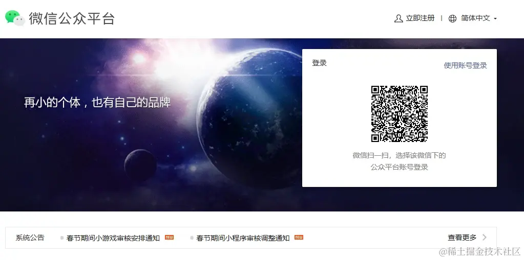 首先,我们是以个人开发者的身份注册,注册过程中,需要使用管理员微信扫码验证,验证之后才可以完成注册,这里就不仔细展开了,注册成功之后,再次打开微信公众平台,用管理员微信扫码,然后再选择你的小程序账号登入,如图: