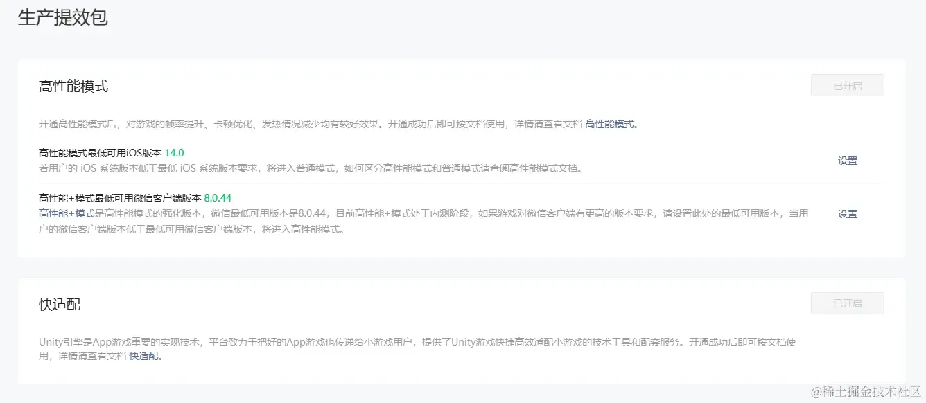 将能力地图->生产提效包里的高性能模式和快适配打开。