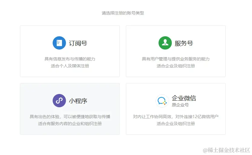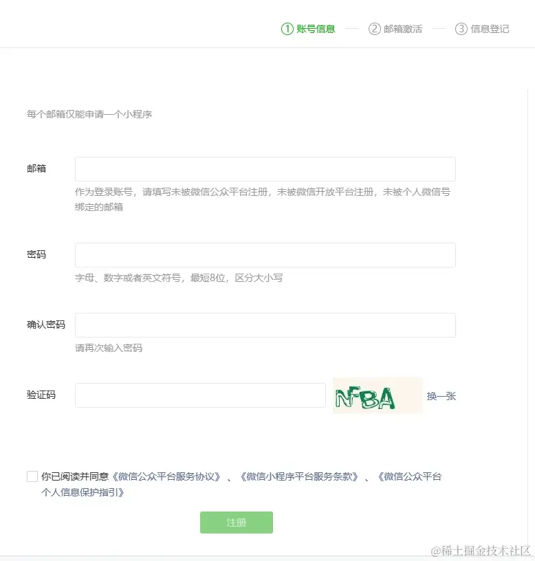 我们首先要准备一个可以正常使用的微信账号,一个没有被微信绑定过的邮箱,微信账号用来当小程序的管理员。
