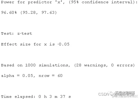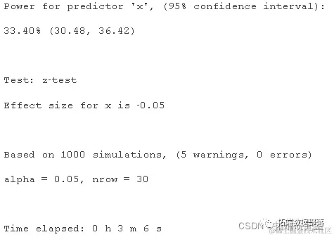 在 r 中,通过重复以下三个步骤来计算功效:(i) 使用提供的模型模拟因变量的新值;(ii) 将模型重新拟合为模拟因变量;(iii) 对模拟拟合应用统计检验。在此设置中,已知存在测试效果,因此每个阳性测试都是真正的阳性,每个阴性测试都是 II 类错误。可以根据步骤 3 的成功和失败次数计算测试的功效。