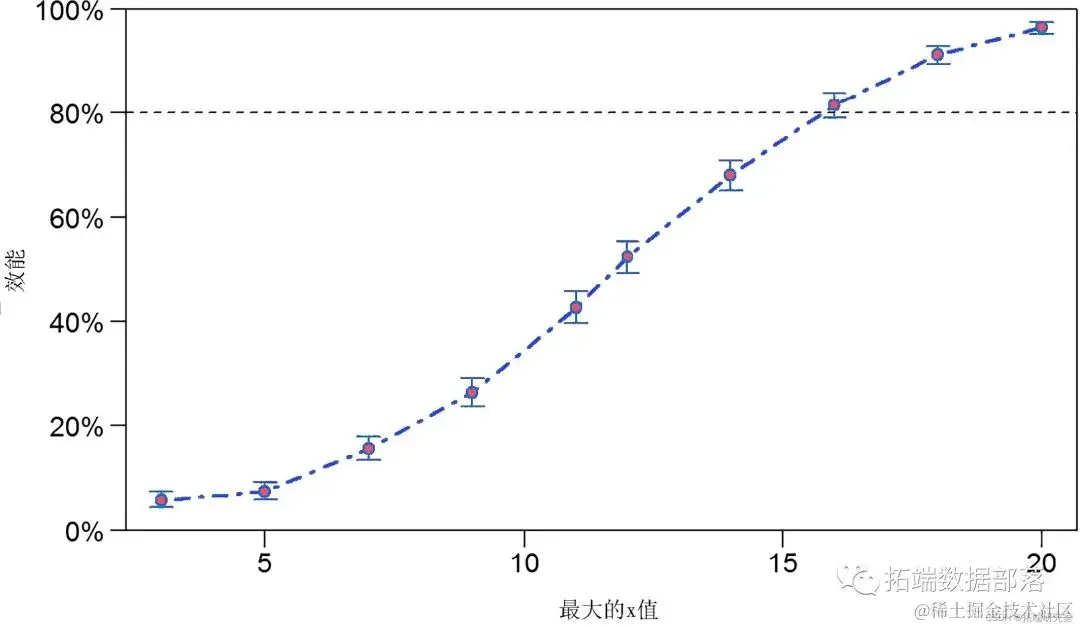 在前面的示例中,当对变量_x 的_20 个值进行观察时,我们发现了非常高的 _功效 _。我们能否减少这个数字,同时保持我们的功效高于通常的 80% 阈值?