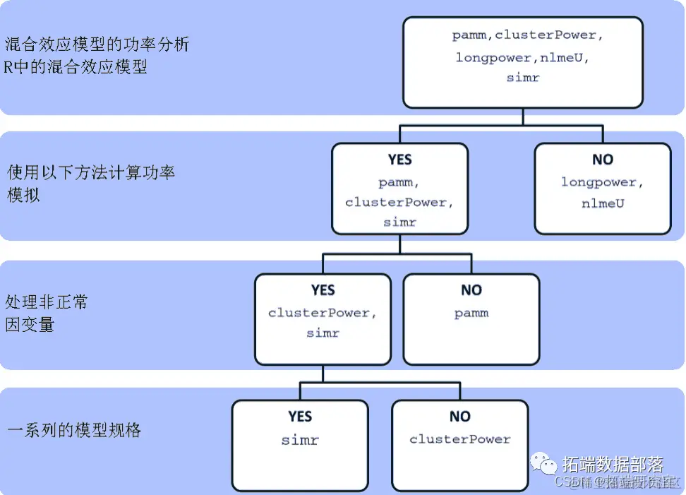 有一系列的 r 包目前可用于混合模型的功效分析 。然而,没有一个可以同时处理非正态因变量和广泛的固定和随机效应规范。