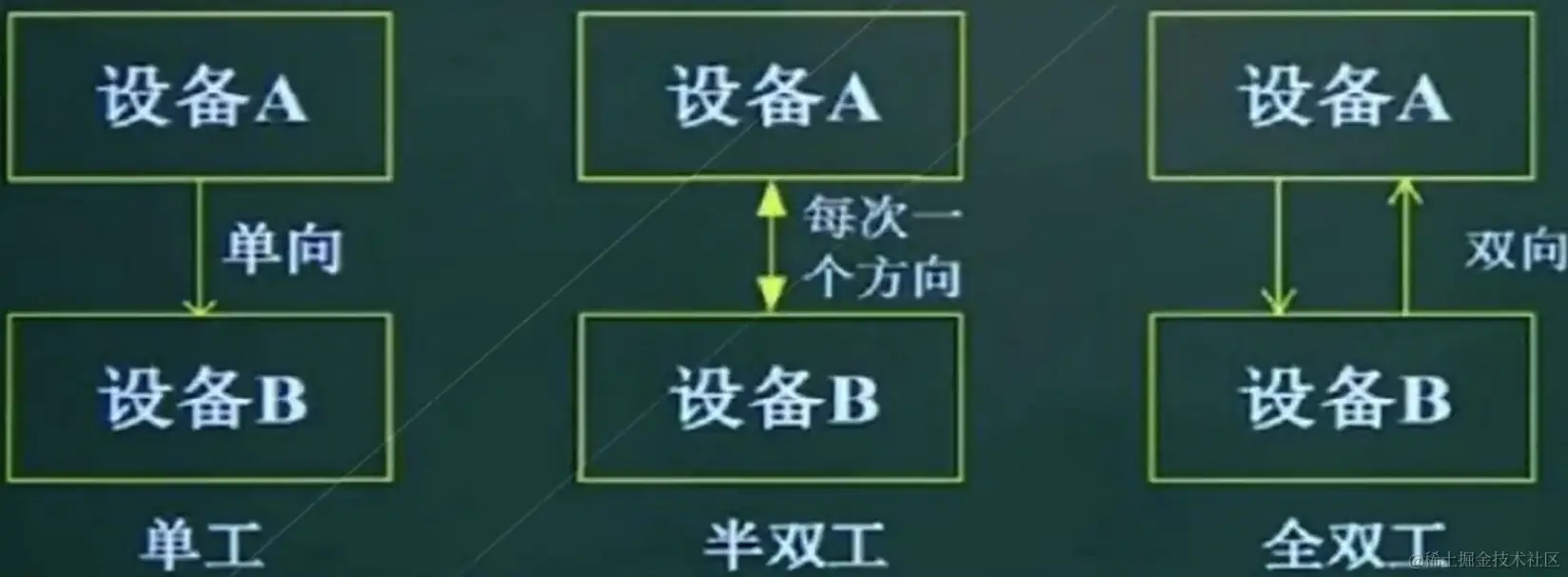 单工:只能由设备A发给设备B,即数据流只能单向流动。