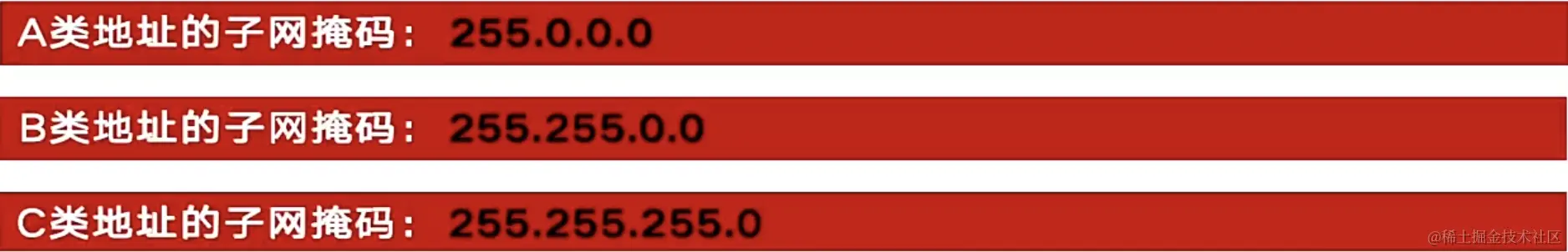 子网掩码也是32位二进制数,网络与子网标识全为1,主机标识全部为0。标准ABC类子网掩码如下: