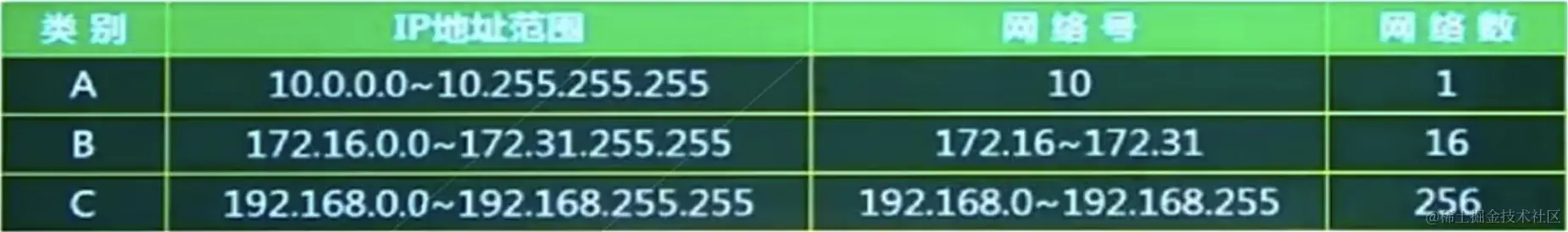 私有地址:属于非注册地址,专门为组织机构内部使用,不能直接访问因特网,下表所示为私有地址范围: