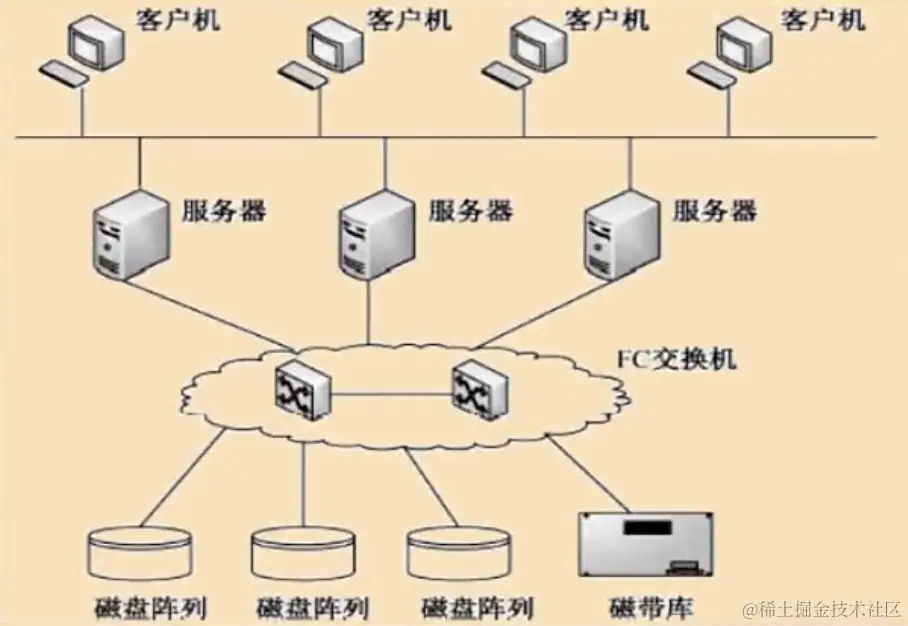 SAN 是通过专用交换机将磁盘阵列与服务器连接起来的高速专用子网。它没有采用文件共享存取方式,而是采用块(block)级别存储。SAN 是通过专用高速网将一个或多个网络存储设备和服务器连接起来的专用存储系统,其最大特点是将存储设备从传统的以太网中分离出来,成为独立的存储区域网络,SAN 的系统结构如图所示。