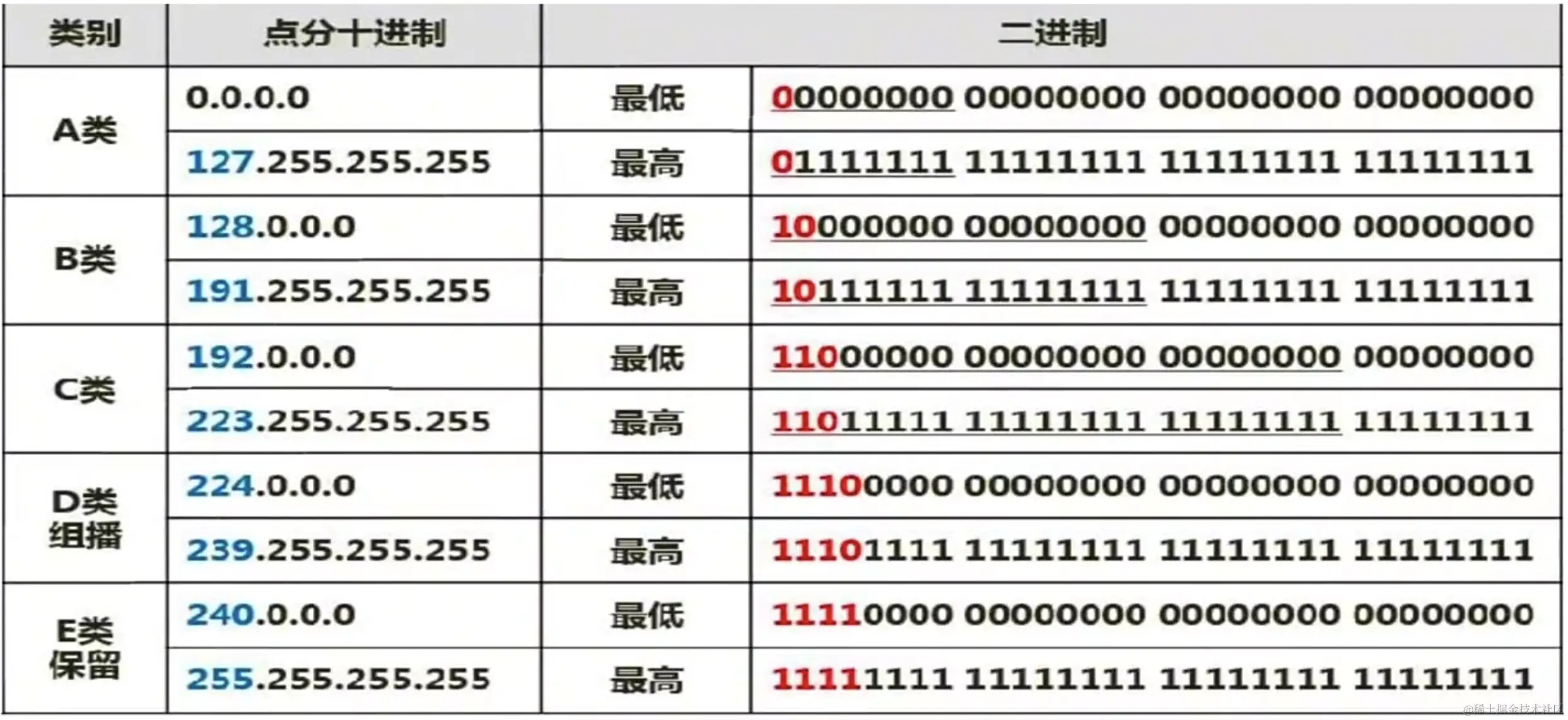 在逻辑上,IP 地址分为网络号和主机号,依据网络号位数的不同,可以将IP 地址分为以下几类: