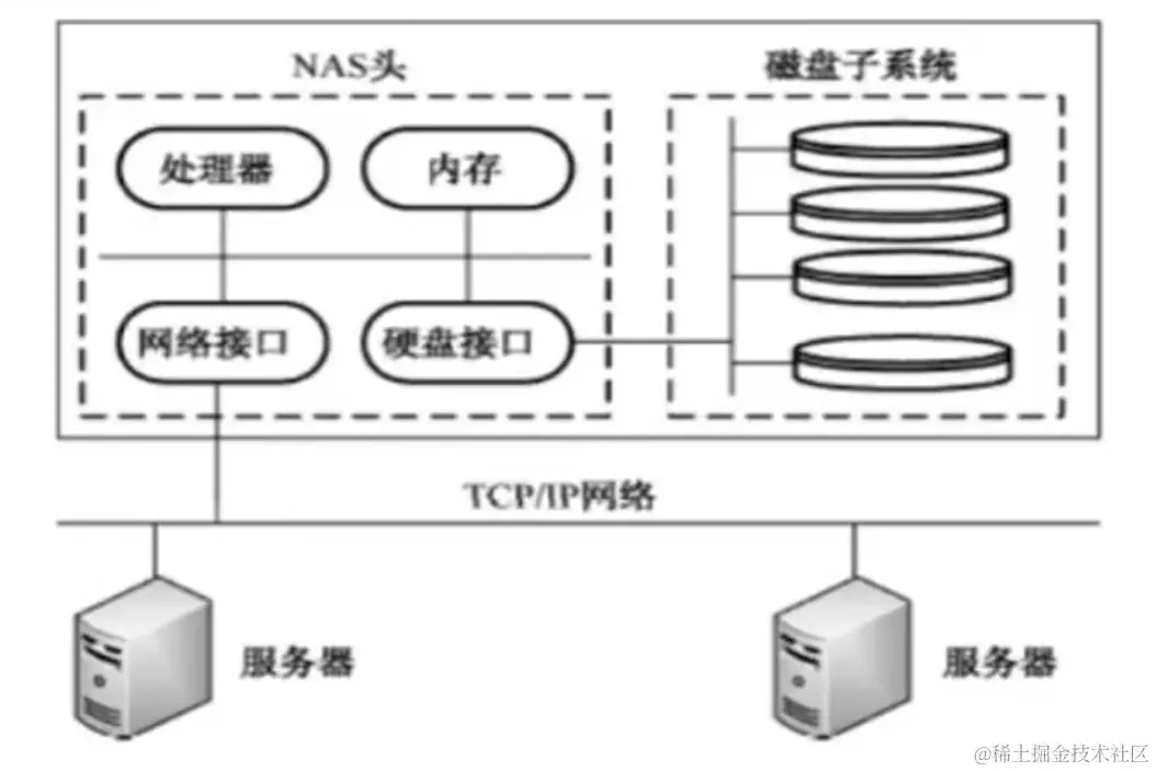 DAS 是将存储设备通过 SCSI ( Small Computer System Interface 小型计算机系统接口)电缆直接连到服务器,其本身是硬件的堆叠,存储操作依赖于服务器,不带有任何存储操作系统。因此,有些文献也把 DAS 称为 SAS (Server Attached Storage,服务器附加存储)。