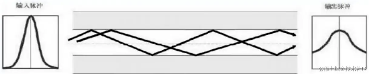 多模光纤MMF:纤芯半径较大,因此可以同时传输多种不同的信号,光信号在光纤中以全反射的形式传输,采用发光二极管LED为光源,成本低,但是传输的效率和可靠性都较低,适合于短距离传输,其传输距离与传输速率相关,速率为100Mbps时为2KM,速率为1000Mbps时为550m。