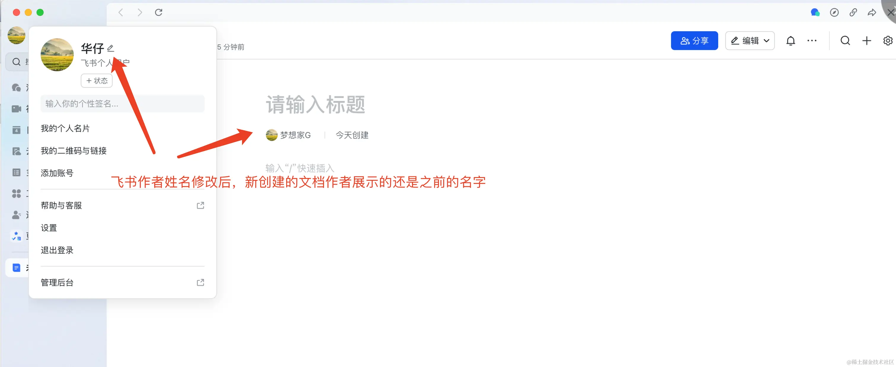 文档作者这里展示名字,和修改后的名字不同步,需要在管理后台修改,个人版没有管理后台,有个替代方案可以同步修改