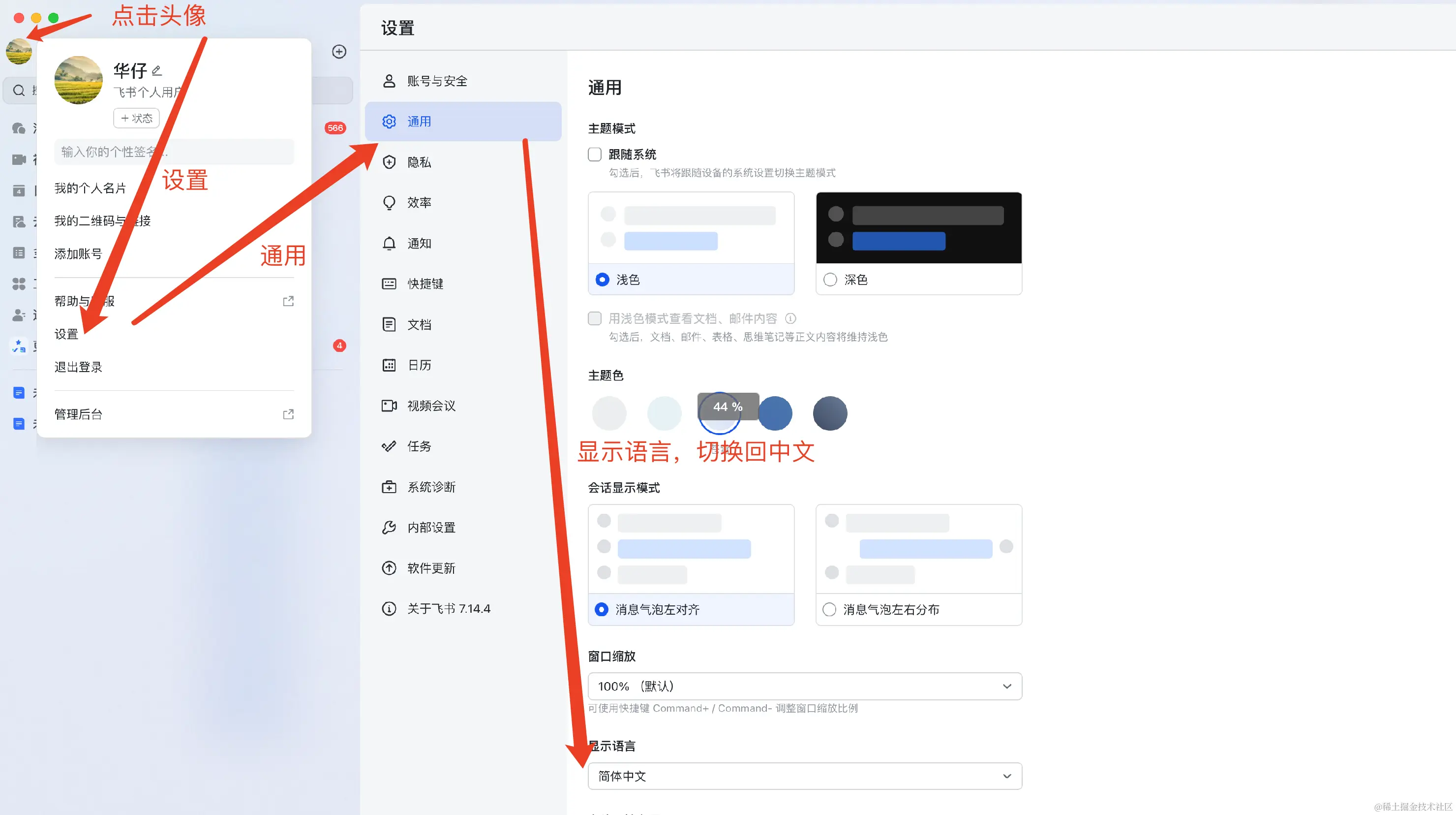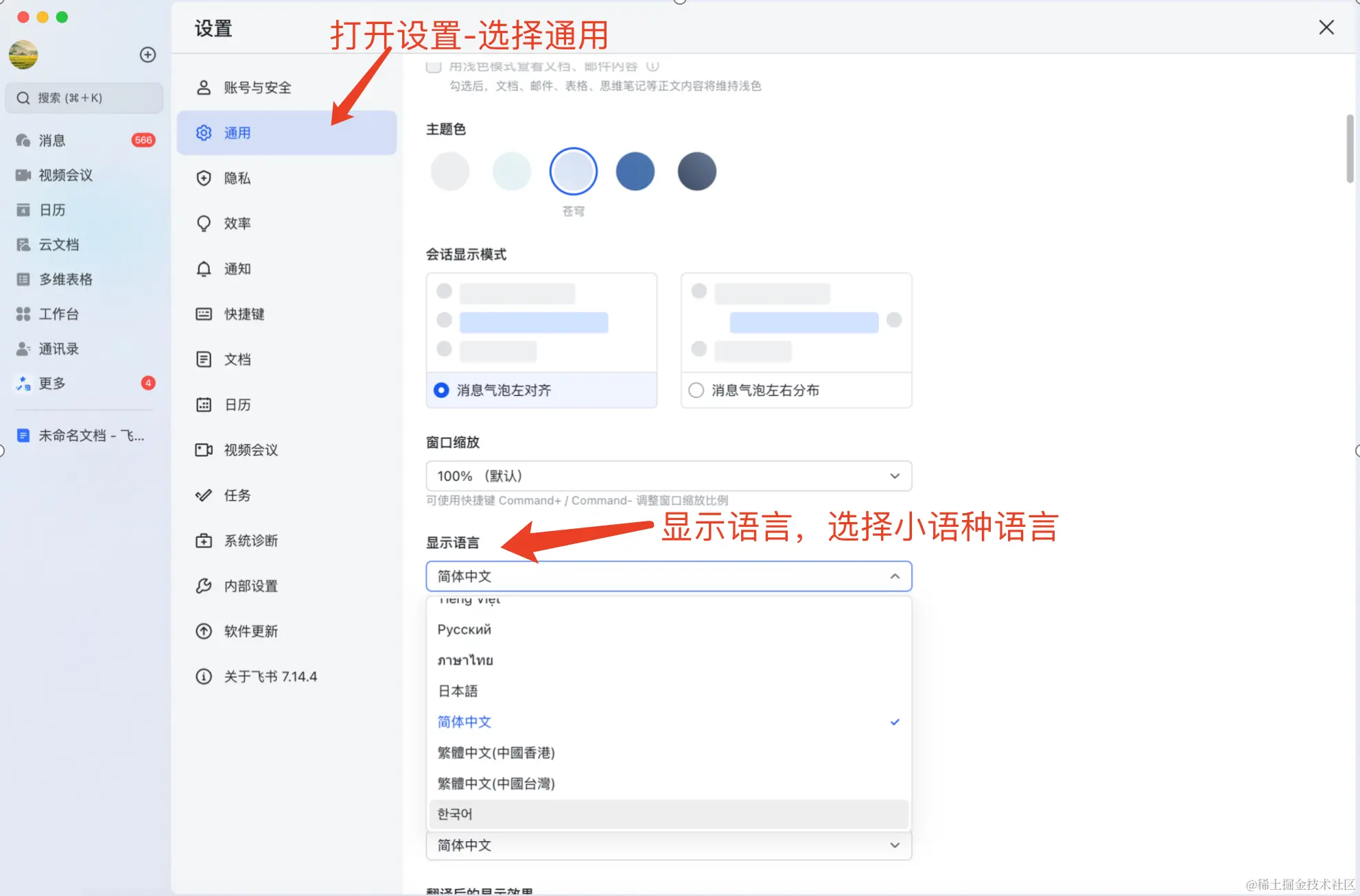步骤1:客户端点击头像,设置,通用,把显示语言修改为小语种(这里以韩文举例)