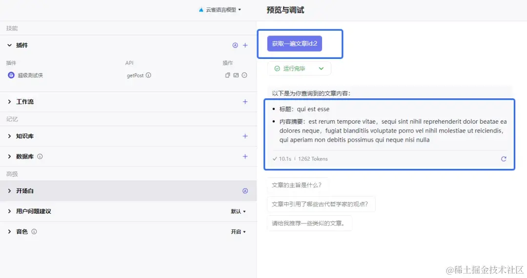 哦耶!可以看到,玄幻大师执行了我们的超级测试侠插件,并启动了获取文章技能(getPost)。
