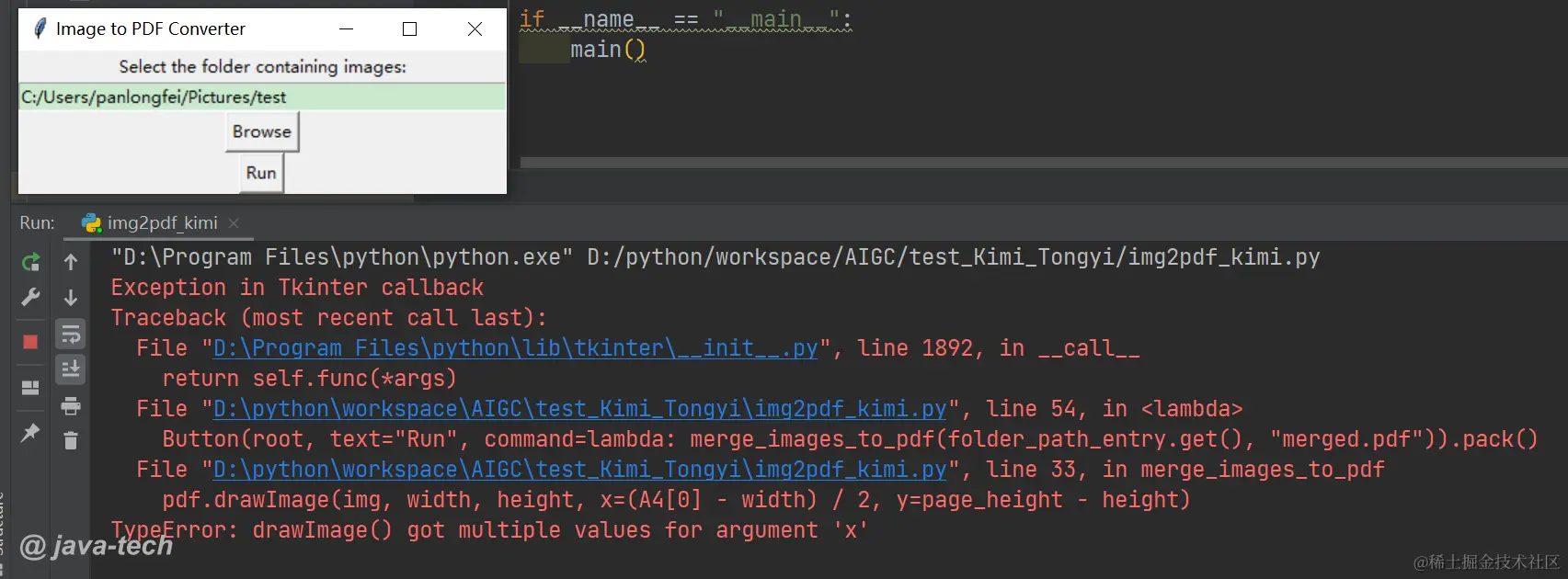 第一次运行有错误,很正常,我们继续把错误发给kimi,让他修复。