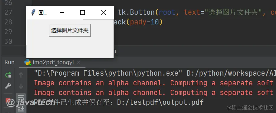 需求:把一个文件夹中的图片转换成pdf文件,要求有一个界面,可以选择图片所在路径,然后点击运行,可以生产pdf文件,然后输出pdf所在路径。请保证相关的包都导入,如果用到字体,使用宋体常规。
