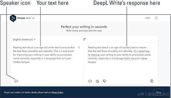 您在左侧面板输入文本,如图 10-3 所示。然后在右侧面板中,这个 AI 模型会向您展示如何改进或重新表达您的文本。DeepL Write 捕捉您原始文本中的上下文、细微差别和风格,并利用这些生成重新表达建议和词语替代。