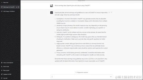 图 5-1: ChatGPT-4 在提示后列出了有关其使用的警告。