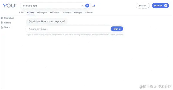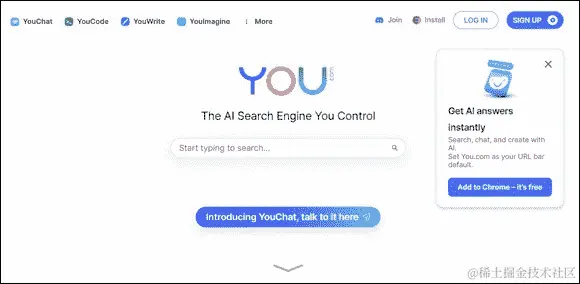 You.com (https://you.com)是一款由 AI 驱动的个性化和基于隐私的搜索引擎,具有类似 ChatGPT 的 YouChat 作为其聊天功能。You.com 用户通过对结果、结果来源和应用程序进行投票来个性化这个搜索引擎。这样可以微调搜索引擎,根据用户的偏好提供搜索结果。