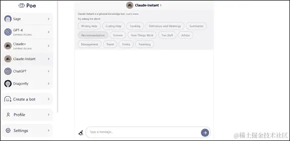 Quora 表示 Poe 是 ChatGPT 最快的界面,因为 Poe 最近进行了速度改进,它支持的所有机器人都更快。Poe 也是唯一一个具有 Claude 的消费者界面,Claude 是由 Anthropic 开发的,Anthropic 是由前 OpenAI 成员组成的初创公司,他们正在寻求构建人工通用智能(AGI),这是科幻传说中的大型 AI。