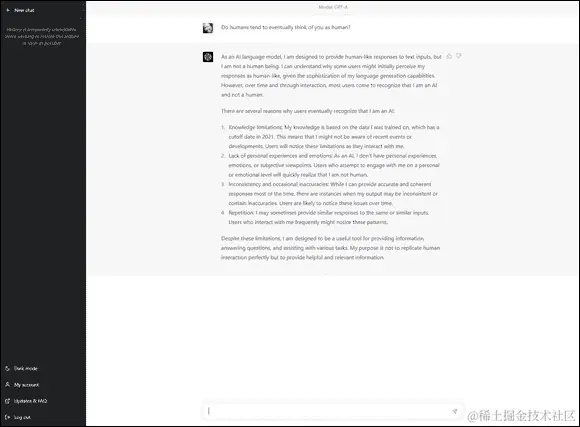 图 5-3: ChatGPT Plus(基于 GPT-4 模型构建的高级版本)在被问及是否被误认为是人类时的回应。