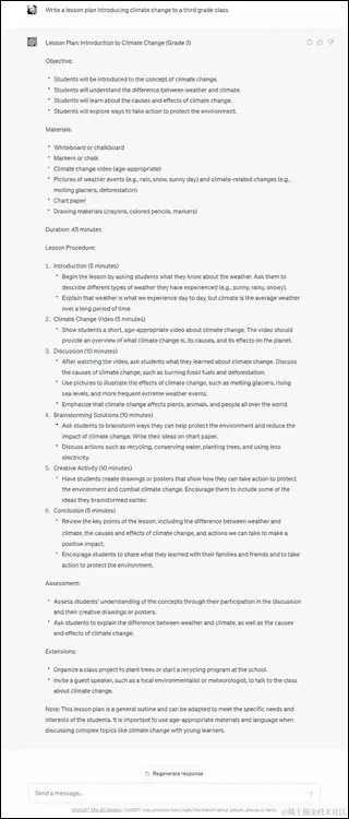 教育将被打破。长期以来,教育一直处于过时状态,我们所知道的教育将被 ChatGPT 和各种生成式 AI 打破。为了让农民的孩子在种植和收获季节离开学校,设计的九个月教育模式不再需要或有用。大规模的传送带式评分系统或正规测试也不再需要。ChatGPT 将使教育工作者能够转向更加定制化的学习模式,学生根据自己对学科的能力而不是年龄、学校年级或学习时间来进步。它是如何做到的?通过使教育工作者分析每个学生的数据,并为每个学生创建定制的学习计划。作业、测试和其他衡量学科能力的措施也可以由生成式 AI 进行评估和报告。