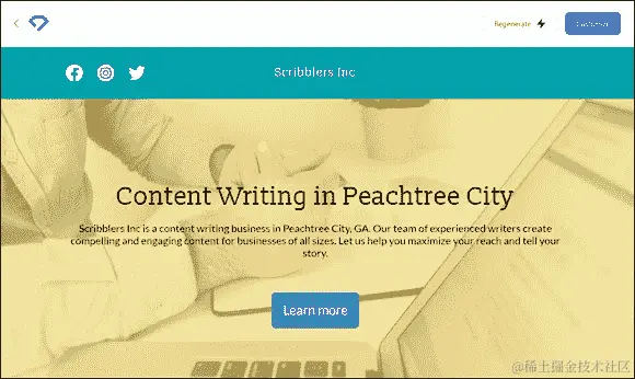 它要求我提供一个企业名称(我编造了 Scribblers)和我的企业做什么。仅凭这两点信息,Durable 在不到 30 秒内为我建立了一个网站。你可以在图 10-14 中看到该网站的部分内容。
