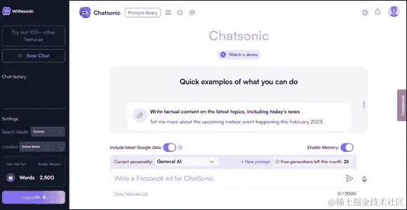 ChatSonic 是另一个由 Google 支持的模型,因此它连接到互联网并可以访问当前信息。语音提示和 AI 图像生成功能对内容创作者来说是一个重要的优势。ChatSonic 就像 ChatGPT 和 DALL-E 合二为一。