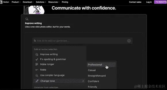 要查看,请访问www.notion.so/product/ai。正如图 10-6 所示,方便的下拉菜单使提示的变体快速。将 Notion AI 视为一个能干的即时文本编辑器!