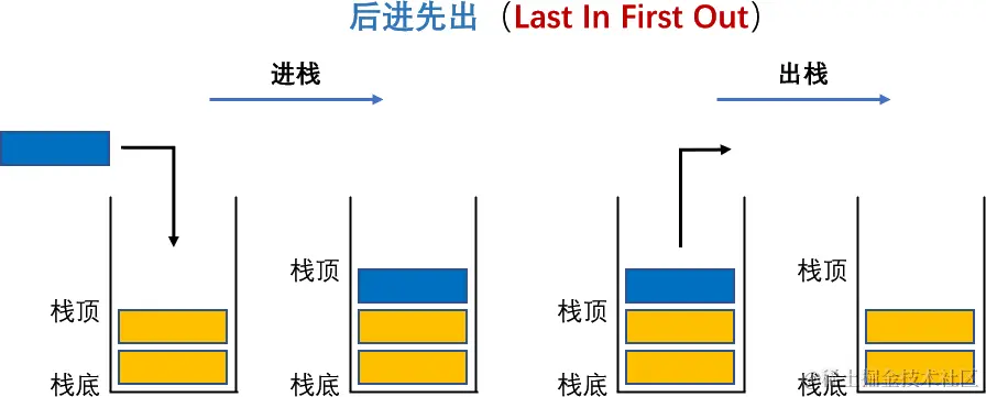 - LIFO(last in first out)表示后进入的元素,第一个弹出栈空间