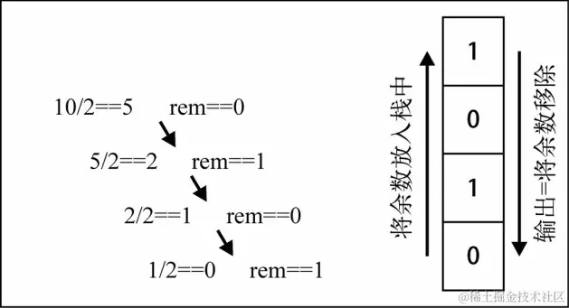 - 举个例子,把十进制数字10转化成二进制的数字,过程如下: