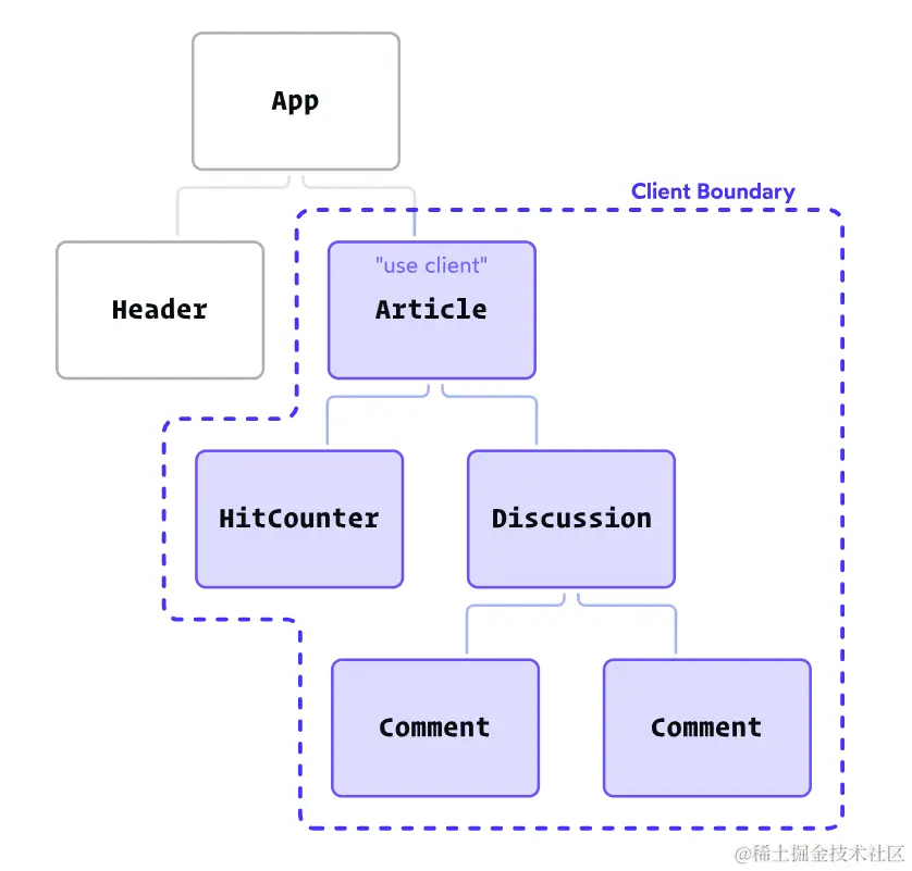 当我们将 'use client' 指令添加到 Article 组件时,我们创建了一个“客户端边界”。边界内的所有组件都隐式成为客户端组件。即使像 HitCounter 这样的组件没有使用 'use client' 指令,在这种特殊情况下它们仍然会在客户端上进行水合和渲染。