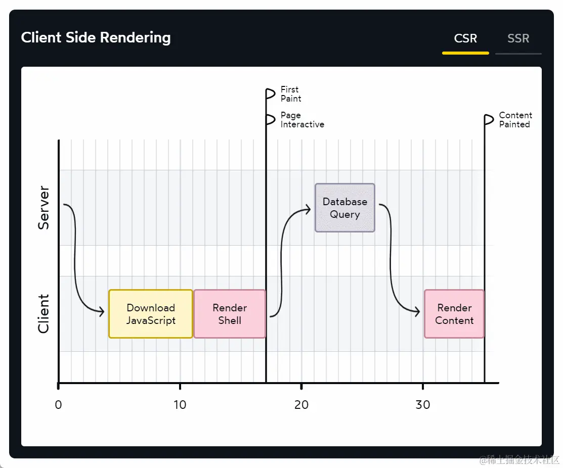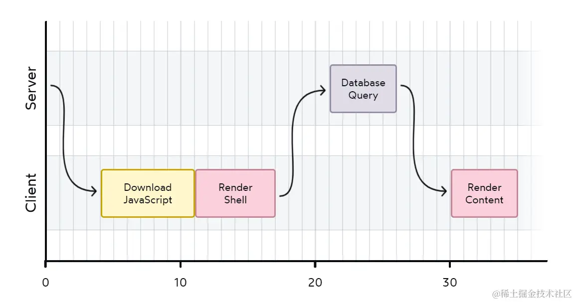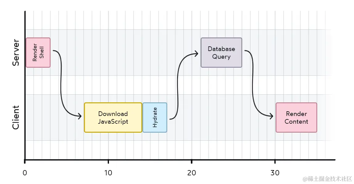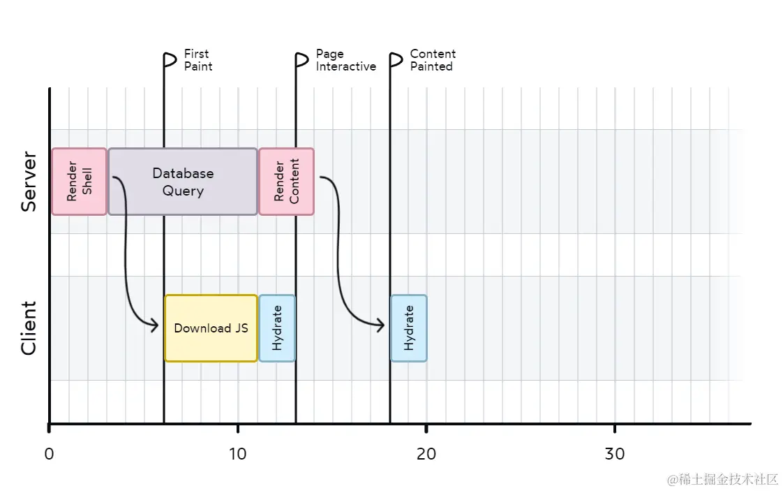 可以看到,“Render Shell”阶段被放在了服务端,也就是说用户收到就不是空白 HTML 了,这是比客户端渲染好一点的地方,至少没有白屏了。