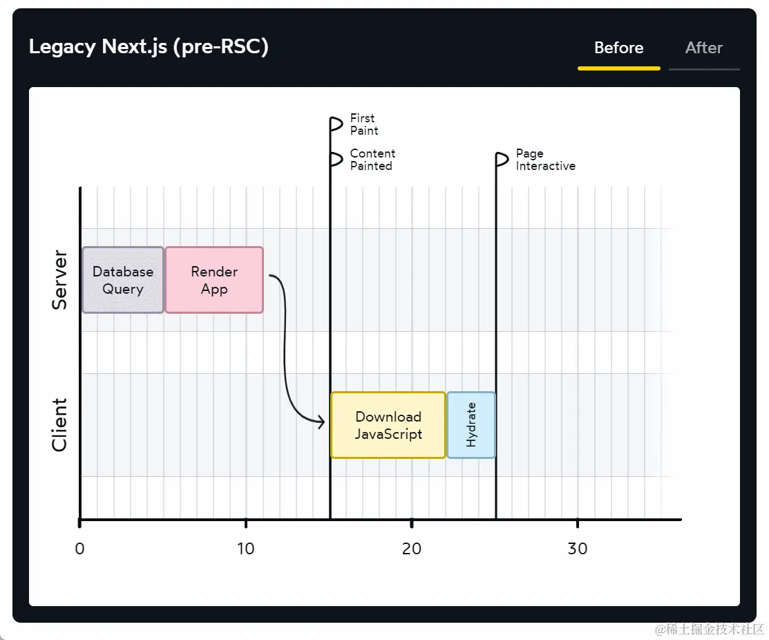 我们不会在客户端和服务器之间来回切换,当数据库查询结果作为初始请求的一部分时,在客户端接收到的 HTML 文档中,就包含用户向看到的内容了。