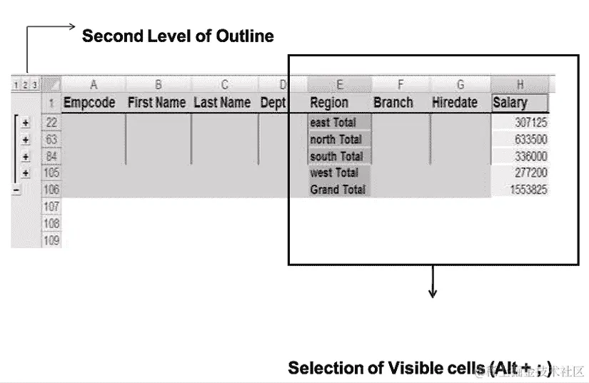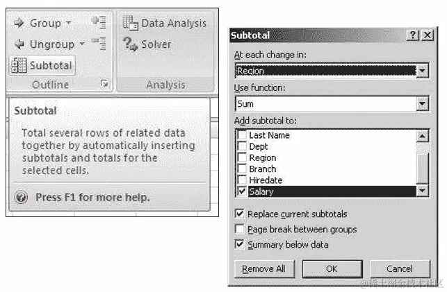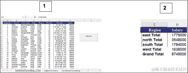 创建一个宏,该宏将提取按区域划分的薪水总和(使用“薪水工作表”)。单击“小计”按钮后,应在新工作表上添加按区域划分的小计,如下所示图 15.3: