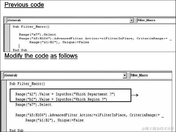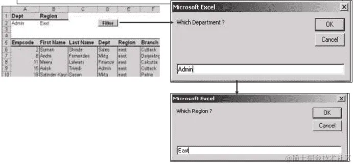 例如,在场景 5 中,不要在 Excel 中更改条件,而是让你的宏询问区域和部门。用户将输入然后点击“确定”。然后,宏将执行筛选。