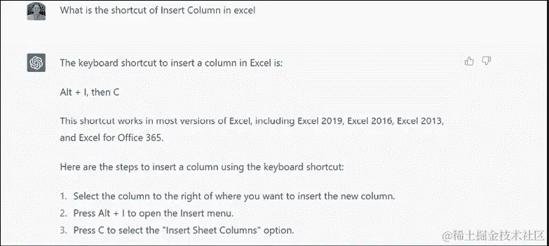 获取使用 Excel 的技巧和窍门:ChatGPT 可以为更有效地使用 Excel 提供技巧和窍门。例如,您可以要求快捷方式、格式设置技巧或自动化任务的方法,如图 25.2 所示: