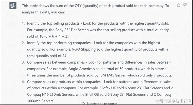 从数据分析中获取见解:Excel 可用于分析数据并生成见解,如图 25.3 所示。ChatGPT 可以帮助您解释分析结果或建议新的查看数据的方式,如图 25.4 所示: