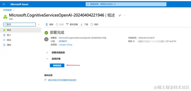 确认没问题后点击创建,之后系统会开始部署资源,部署好是这样的,我们点击转到资源: