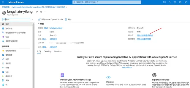 我们复制一下其中一个密钥和终结点的链接,因为在langchain要用到: