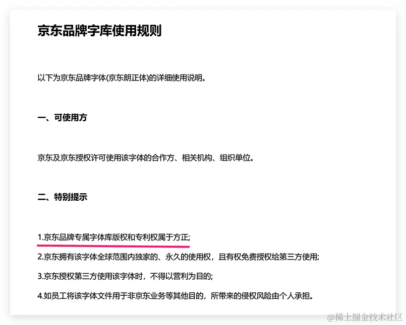 比如 JD 公司就自主开发了一套商用字体京东朗正体,支持三种粗细。只允许 JD 公司自己用,别家公司不允许用。如下: