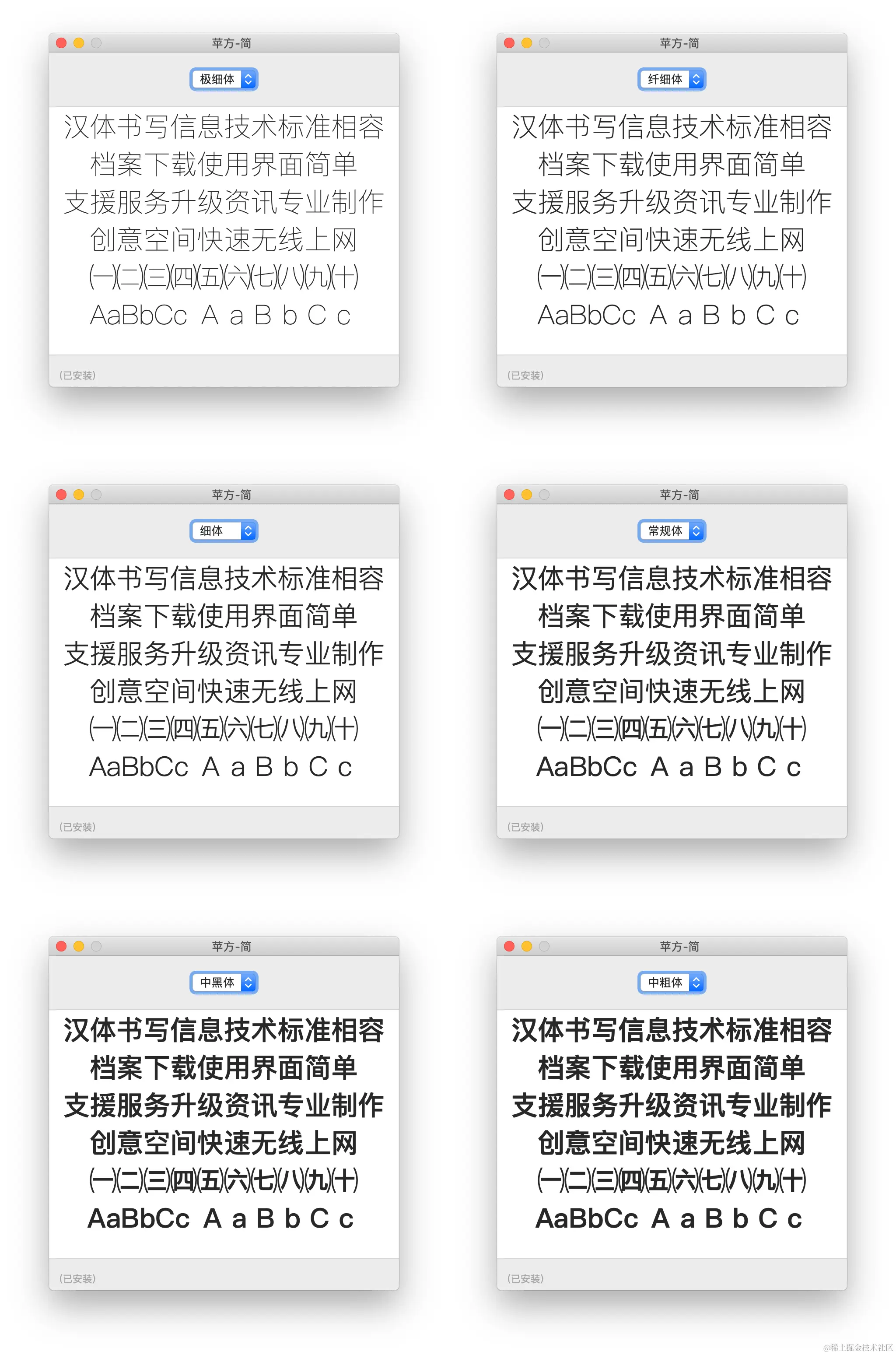 1、Mac & iOS 平台的“苹方”字体的字重:(有6种粗细,>=600的加粗效果是相同的)