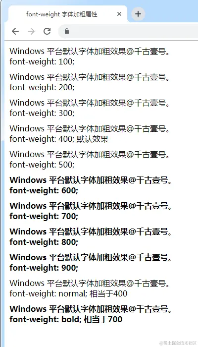 关键问题来了。很多人会发现,在 Windows 平台的浏览器中, font-weight 无论是设置300、400,还是500,文字的粗细都没有任何变化,只有到600的时候才会加粗一下,感觉浏览器好像不支持这些数值,那搞这么多档位不就是多余的吗?